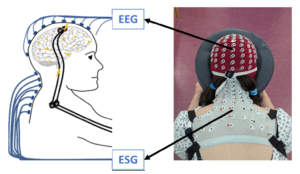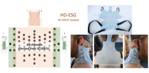 The new ESG electrode patch—the physical realisation of the SC10X/U system—works on a similar principle to how an EEG cap implements the 10-20 electrode system for brain recordings. Made from stretchy, breathable material in multiple sizes, it fits precisely along the neck and upper spine using key anatomical landmarks. Electrodes are filled with conductive gel for clear recordings and secured with fasteners and elastic bands.